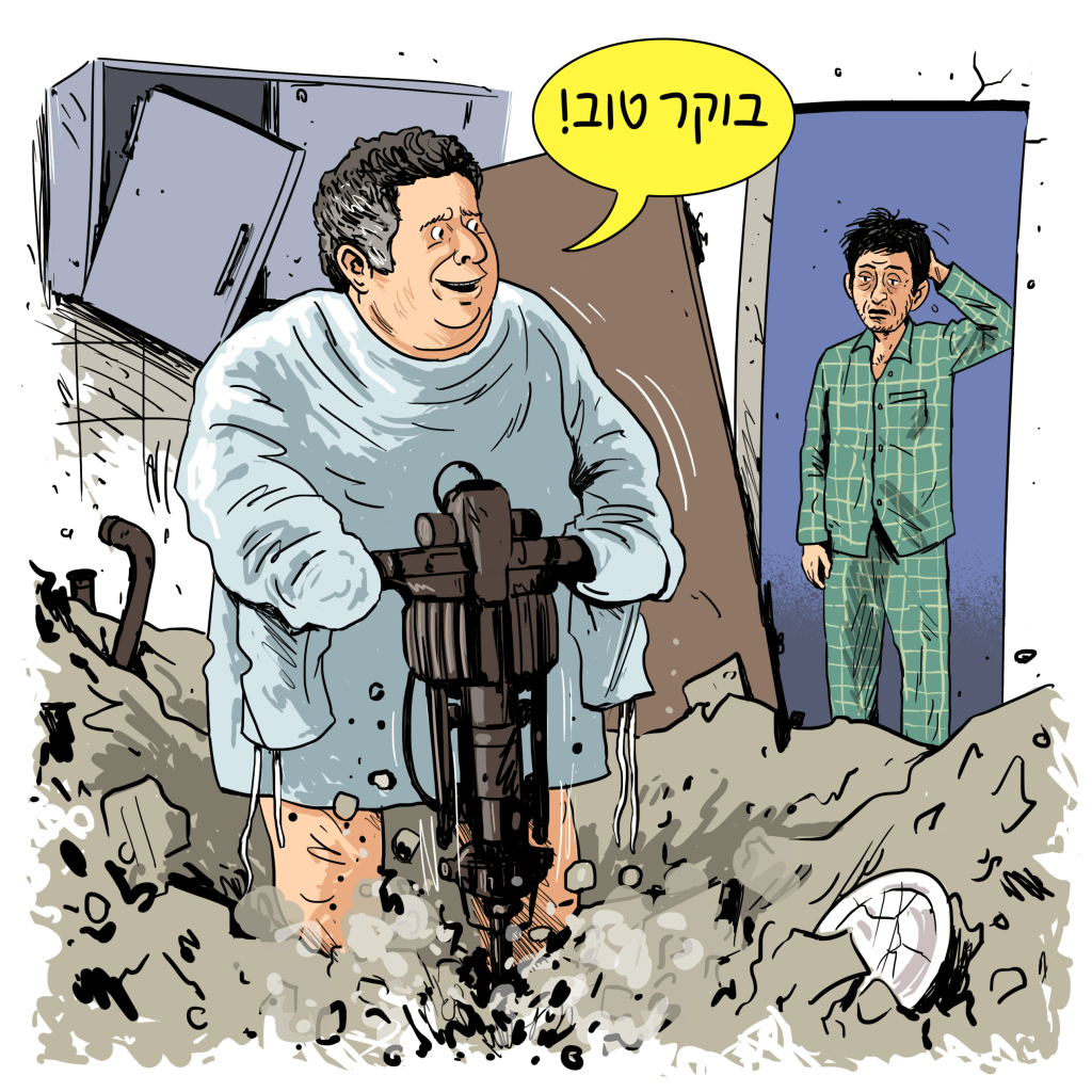 * "מאיפה אפשר להיכנס אליכם?" – אני חשבתי, כאילו, מהדלת, אבל עכשיו אני מבין שאין סיכוי שלוחות הגבס האלה יעברו דרכה, אז מה תעדיפו: שנשבור שני קירות או שנעבור לבית צמוד קרקע במושב ופשוט תיכנסו מהשדה?
