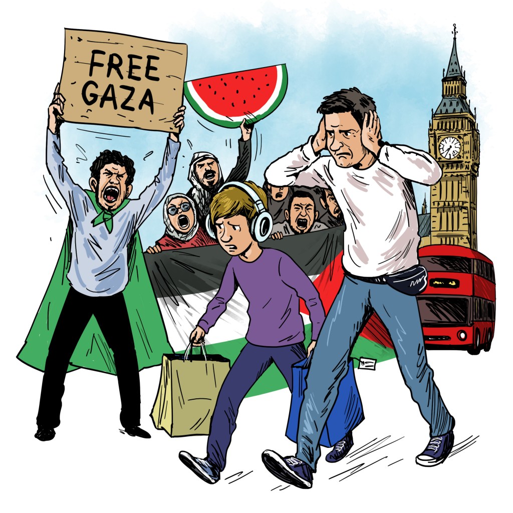 אנחנו בקמדן, לונדון, והוא מודד ומתחבט זמן ארוך ובסוף אנחנו בתור לשלם, ושם, ליד שלוש הקופות, זה מונח, בערימות מסודרות: מגזין לחלוקה חינמית שהעמוד הראשון שלו שחור לגמרי ועליו כתוב, בפונט לבן ענקי: "ישראל מבצעת רצח עם בעזה. הרימו את קולכם".